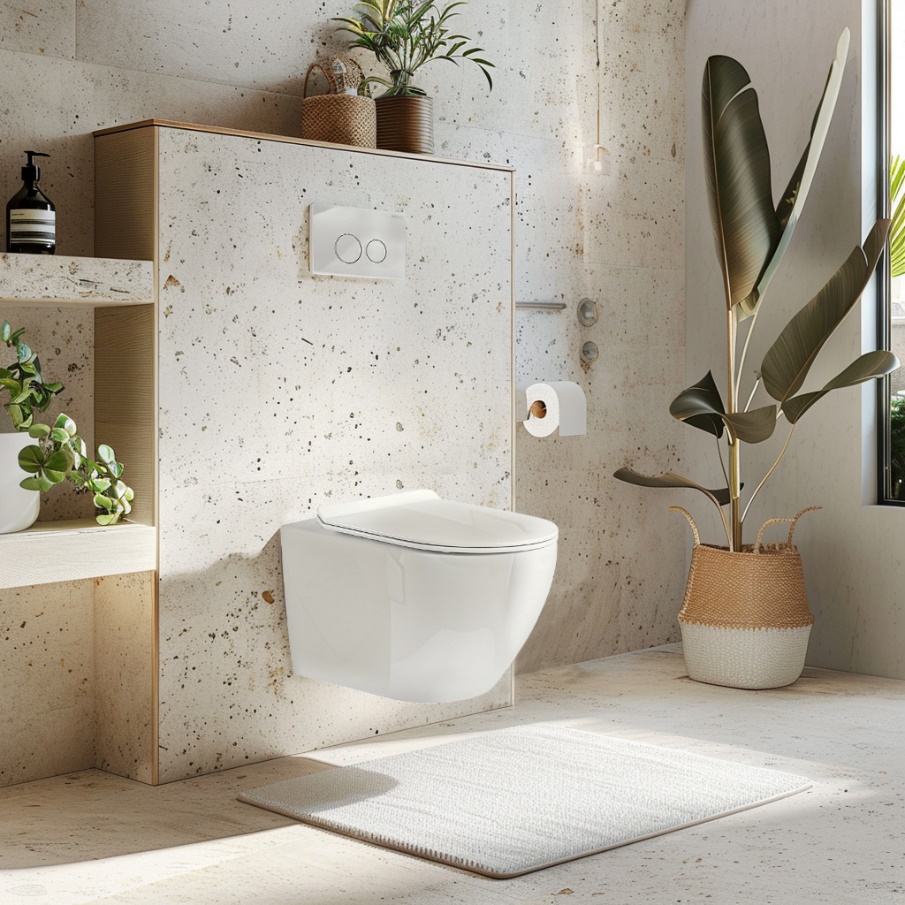 При выборе унитаза стоит обратить внимание на простые формы и минимум декора. Для ощущения легкости и простора можно использовать подвесной унитаз с инсталляцией.