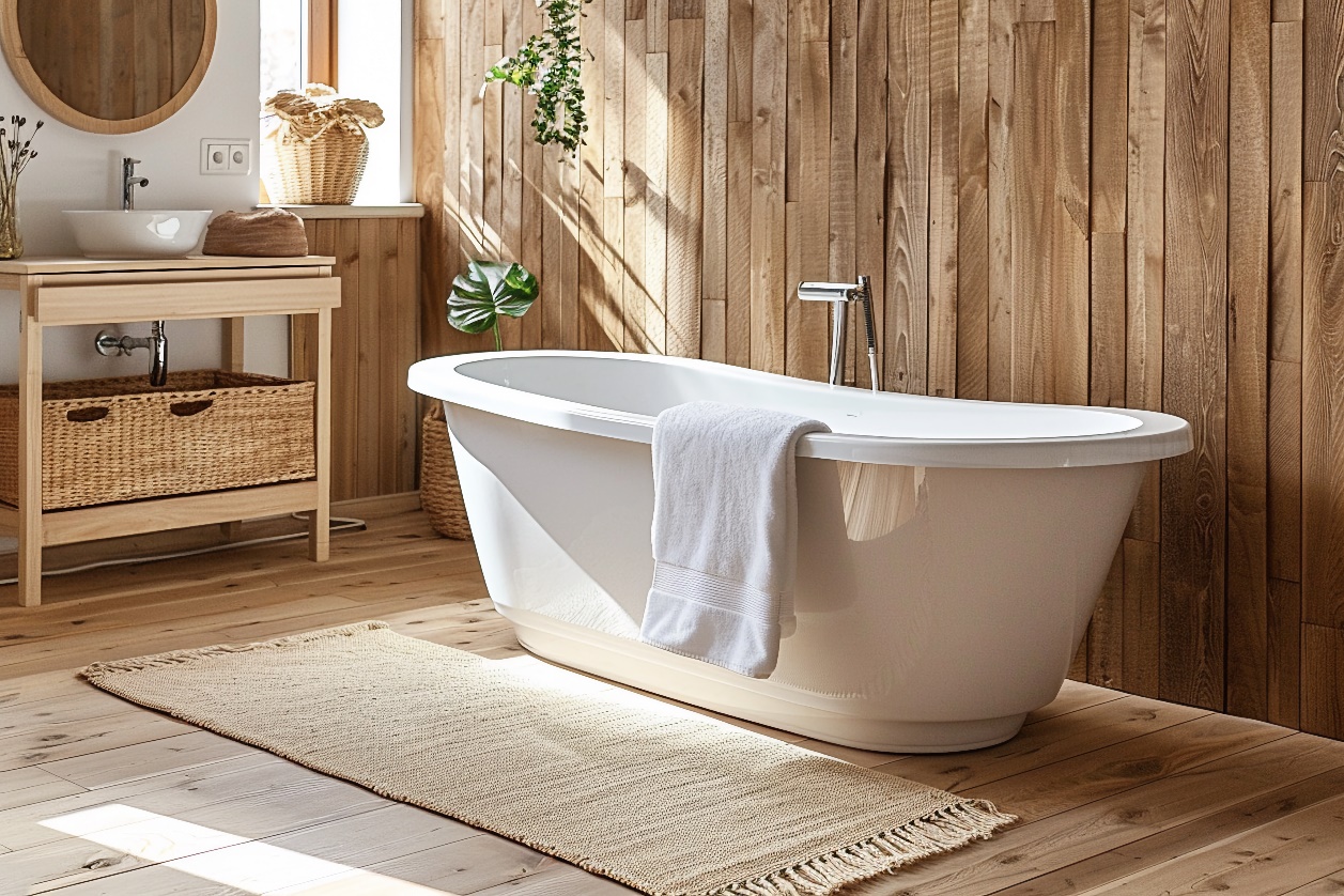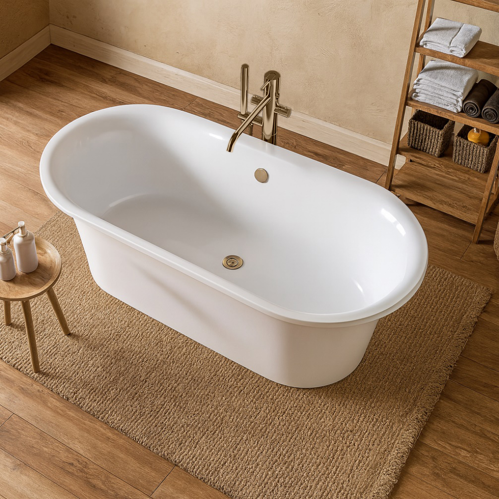 Идеальным решением будет отдельно стоящая ванна на ножках из акрила или литьевого мрамора. Важно учитывать, чтобы форма не была слишком урбанистичной: более округлые и «мягкие» варианты станут лучшим решением. Литьевые ванны BAS станут идеальным выбором – изготовленные из мраморной крошки, они превосходят обычные акриловые ванны в долговечности. Для любителей душа, можно установить ограждение с прозрачными стеклянными дверцами и тропическим душем.