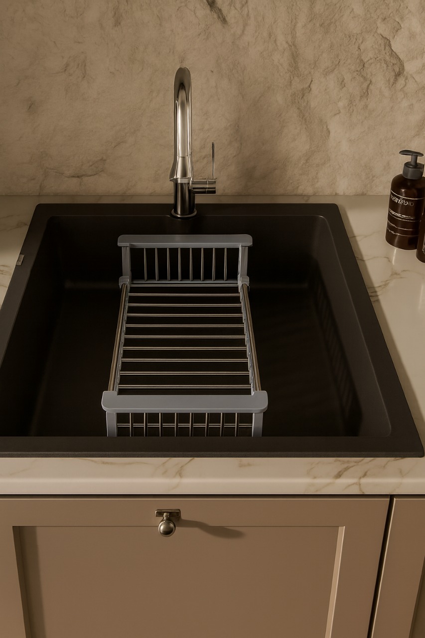 Металлическая часть обеспечивает жесткость конструкции и устойчивость к нагрузкам, а пластиковые элементы делают изделие легким, безопасным для поверхности мойки и удобным в ежедневном использовании.