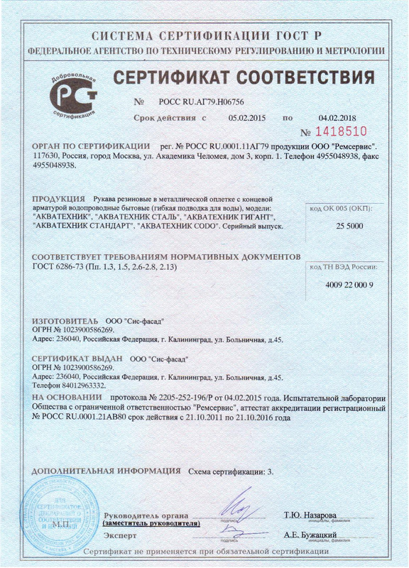 Качество подводки для воды «Акватехник» подтверждено сертификатами, санитарно-эпидемиологическими заключениями и паспортами качества с гарантийными обязательствами.