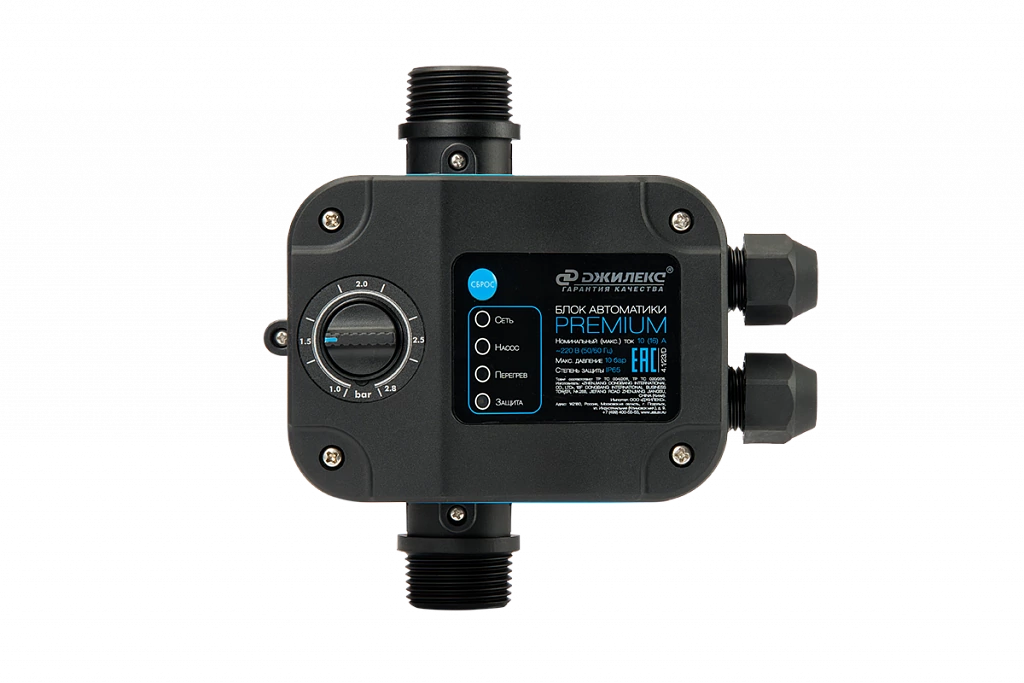 Блок автоматики PREMIUM предназначен для автоматического управления погружными и поверхностными насосами. В конструкцию встроена защита от "сухого хода", работы "в тупик" и перегрева. Блок автоматики оснащен встроенным обратным клапаном, предотвращающим обратный поток воды. Имеет регулировку давления включения насоса.