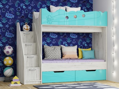 Детская Юниор-15 МДФ кровать двухъярусная (бирюза металлик/дуб крафт белый) (9 мест)