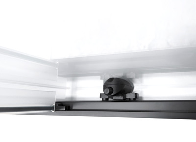 Двойные ролики обеспечивают тихое и плавное открывание двери. Нижние ролики с механизмом отстёгивания обеспечивают легкий доступ к стеклу и профилям для очистки.