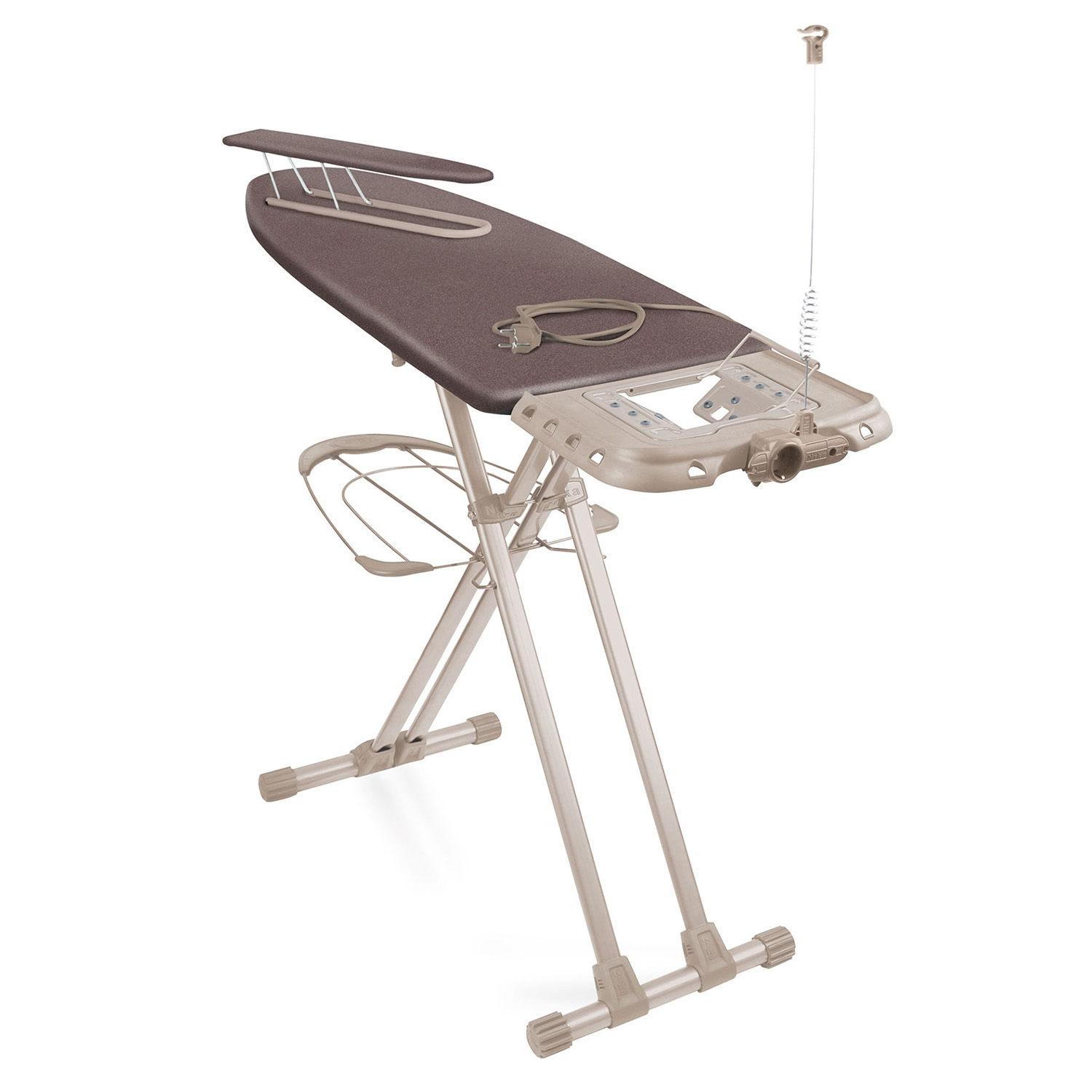 Широкая гладильная доска с электросоединителем и подставкой под утюг и парогенератор. Вместительная полка для белья и переносной подрукавник. Надёжная металлическая поверхность с отверстиями для пара. Съёмный чехол из хлопка с термоустойчивым покрытием. Плавно регулируемая высота рабочего стола до 1 м. Подходит для утюга и парогенератора. Регулируемые опоры для устойчивости на неровном полу.