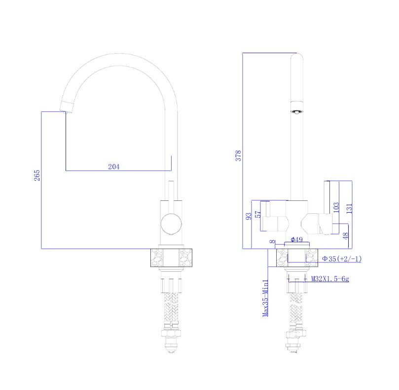 В смеситель установлен картридж D-35 с керамическими пластинами. Высота смесителя 378мм. Излив поворотный 204мм. Высота излива до аэратора 265мм. Аэратор изготовлен из пластика с нержавеющим корпусом.