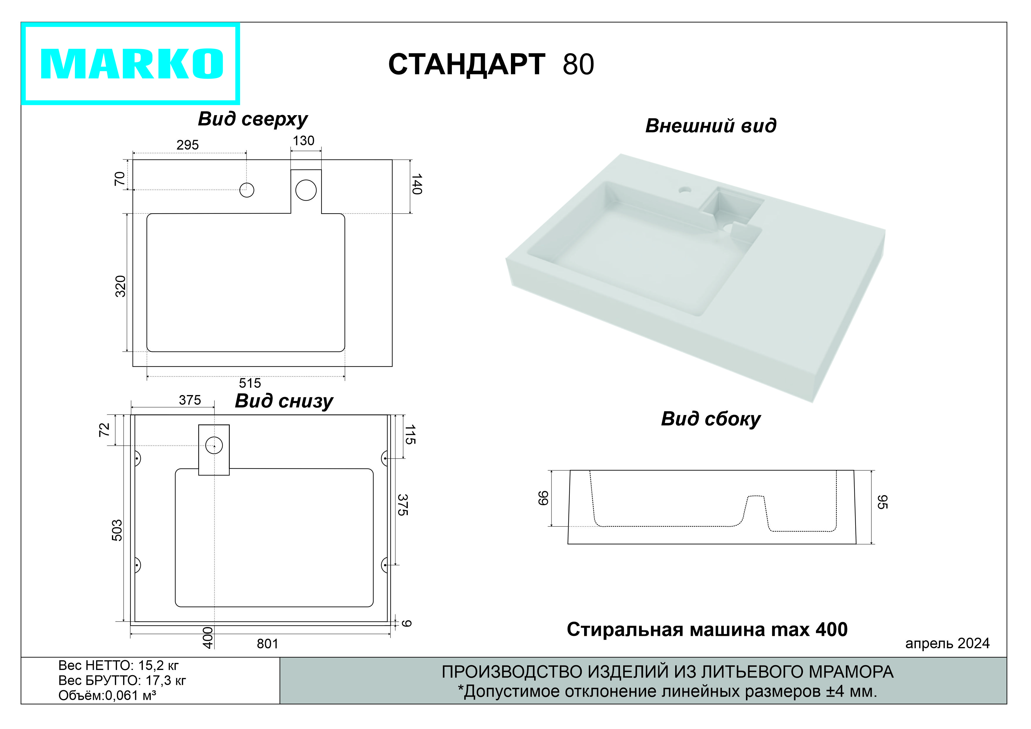 Умывальник "Стандарт 80" левый литьевой мрамор, 801х503х95 над стиральной машиной, в комплекте кроншт., крепл. и декорат.накладка г. Ульяновск